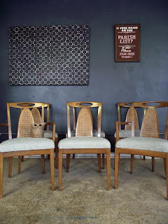 This is an awesome set of Mid Century Dining Chairs. There are four chairs, and two arm chairs. Wonderful, neutral/light gray upholstery. Amazing condition!