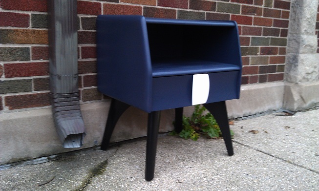 This is a really awesome mid century nightstand end table side table. The framing is a handsome slate grayish blue and the base is a sleek black. There is one drawer with a white drawer pull. A wonderful solid wood piece.